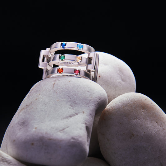 Three-line silver puzzle ring element with ruby gem